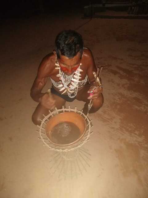 - Cerimônia: Os participantes realizam a cerimõnia em um espaço dedicado, como uma maloca (uma espécie de cabana comunal). Os participantes sentam-se em círculo e o xamã começa a cantar e a tocar instrumentos, como maracás. Essas músicas são parte fundamental do ritual e auxiliam na entrada em estados alterados de consciência.